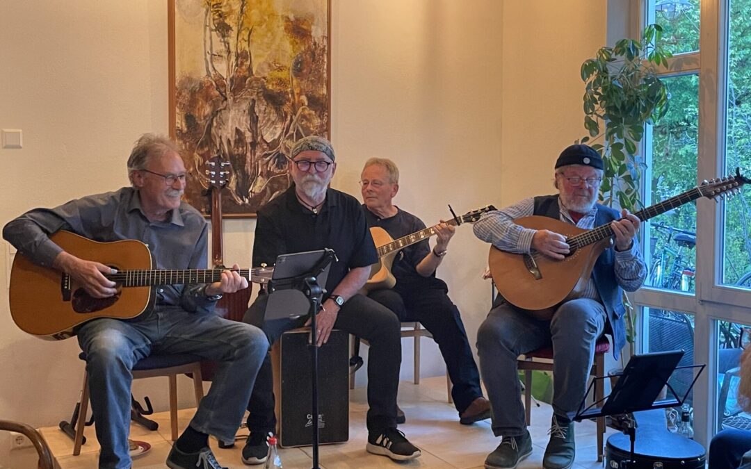 Dass die Gruppe gut eingespielt daherkommt spürte man: „Denen macht das ja richtig Spaß“, meinte einer. Mehrstimmiger Gesang unterlegt mit Rhythmusgitarre, Percussion und filigranem Fingerpicking sowie Melodiebögen auf einem eher seltenen Instrument, der Cister, das ergab zusammen einen sehr gelungenen Abend in bester Stimmung.